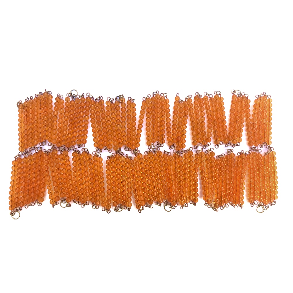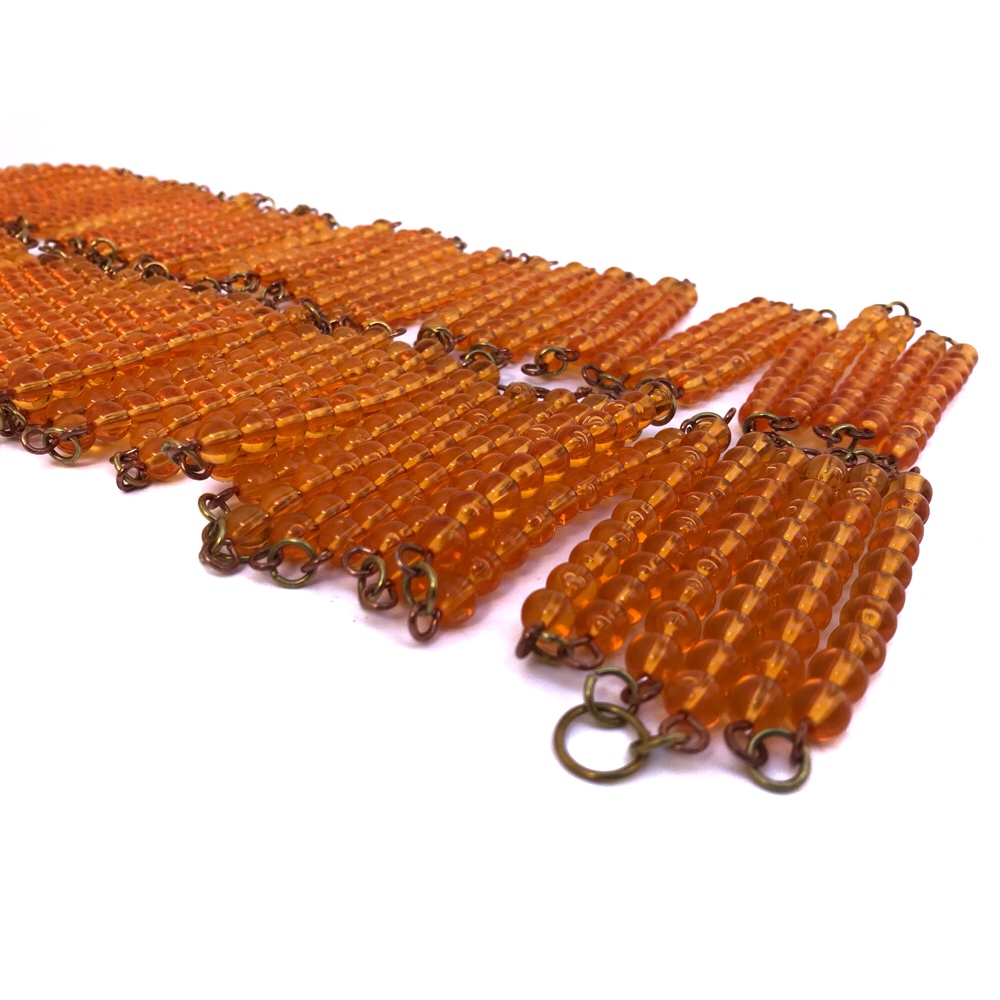 The golden bead chain of 1000 is a material for the development of the mathematical mind. This material arouses a surprising reaction in children, who show great constancy in counting unit after unit, until they naturally arrive at the numbering up to 1000.
