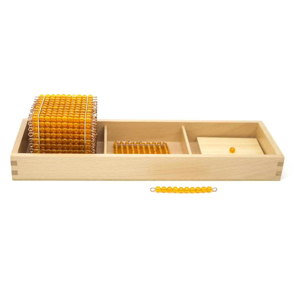 The material for the Introduction to decimal quantityis a material for the development of the mathematical mind that accompanies the child to the knowledge of quantities, i.e. of units, tens, hundreds and thousands and their terminology, and thus indirectly lays the foundations for the knowledge of hierarchies, of geometrical shapes such as the point represented by the bead of the unit, the line represented by the stick of the tens, the square represented by the hundreds and the cube represented by the thousands.