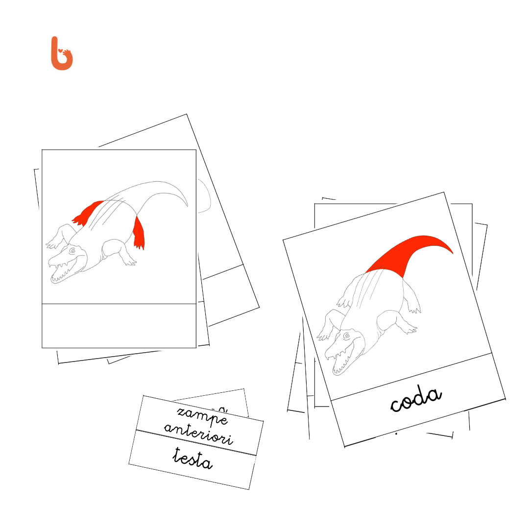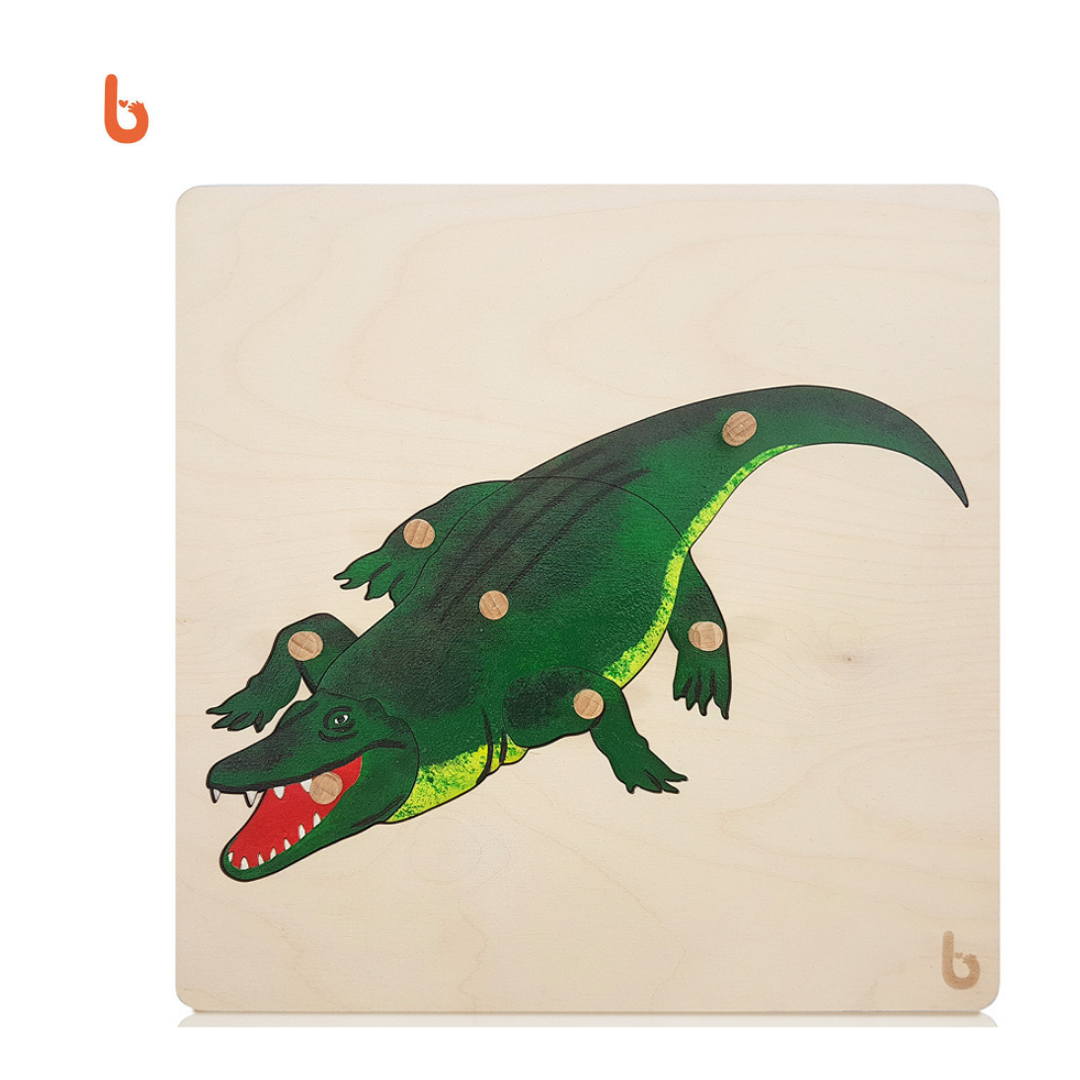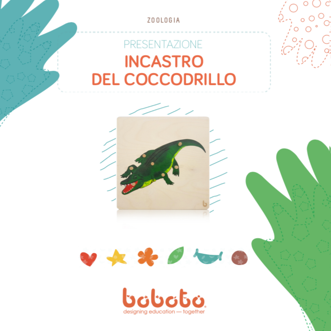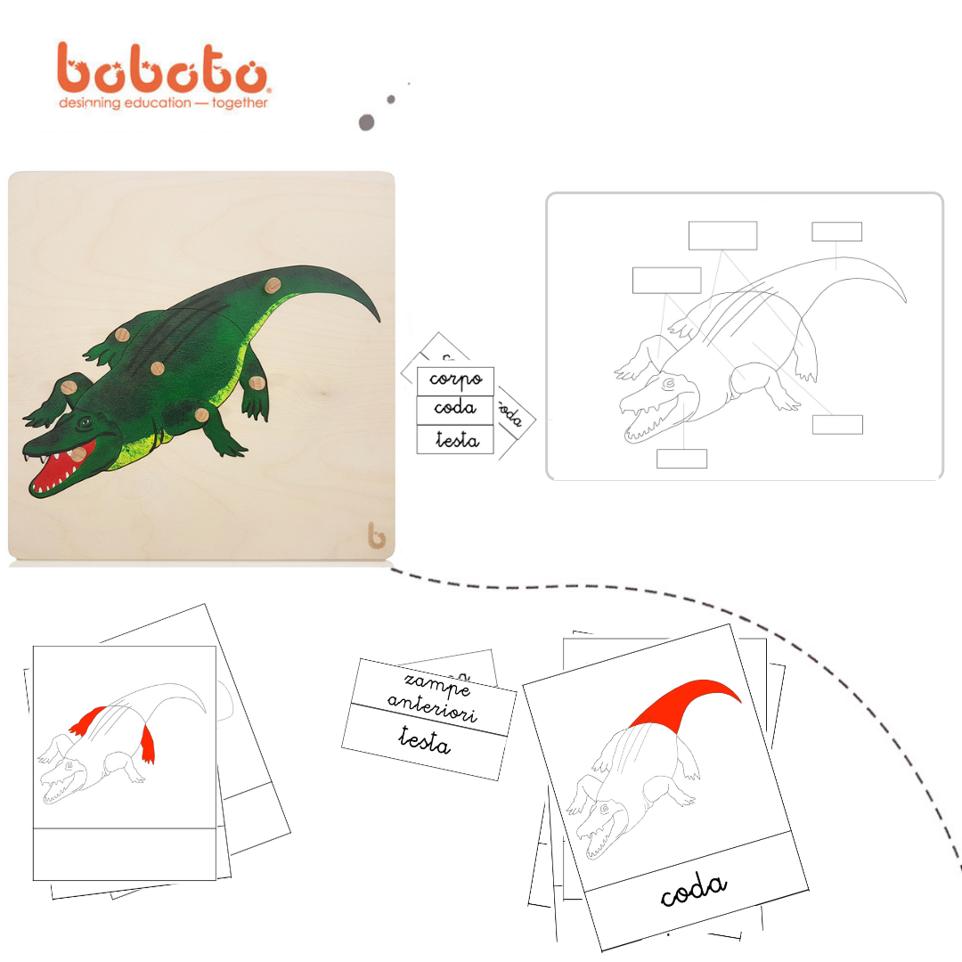 The puzzle is made up of a wooden frame with rounded corners and a crocodile silhouette carved in the centre, which allows the various joints that make up the puzzle to be placed inside. The joints are made of wood and hand-painted, and all have knobs that allow an easy grip to properly handle the parts and to facilitate the fine motor skills of the hand. Manual activity favours sensory memory, allows for experiences that follow on from real activities or stimulate exploration of the environment. Interlocking allows the provision of scientific knowledge, in this case related to zoology. It supports the development of language and facilitates the recognition of all parts of the animal.
