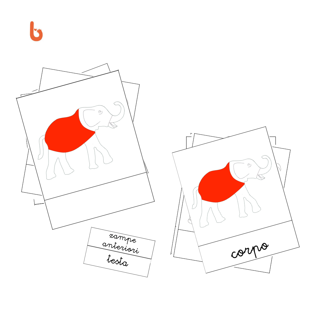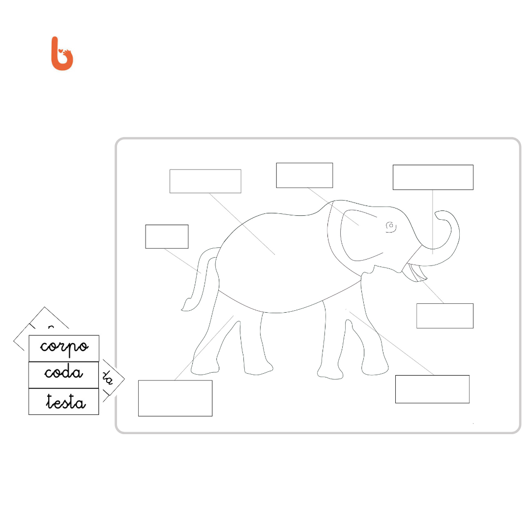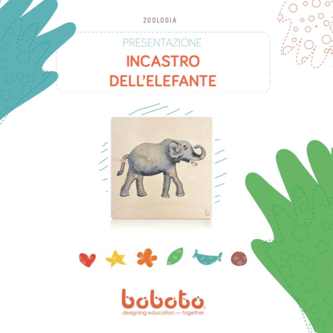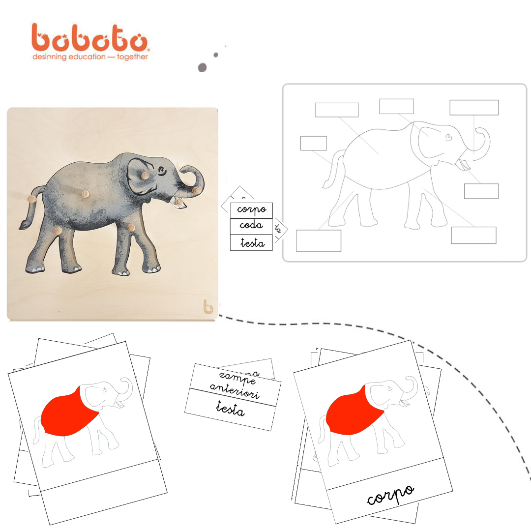 The puzzle is made up of a wooden frame with rounded corners and an elephant silhouette carved into the centre, allowing the various joints to be placed inside. The joints are made of wood and hand-painted, and all have knobs that allow an easy grip to properly handle the parts and facilitate fine motor skills in the hand. Manual activity favours sensory memory, allows for experiences that follow on from real activities or stimulate exploration of the environment. Interlocking allows the provision of scientific knowledge, in this case related to zoology. It supports the development of language and facilitates the recognition of all parts of the animal.