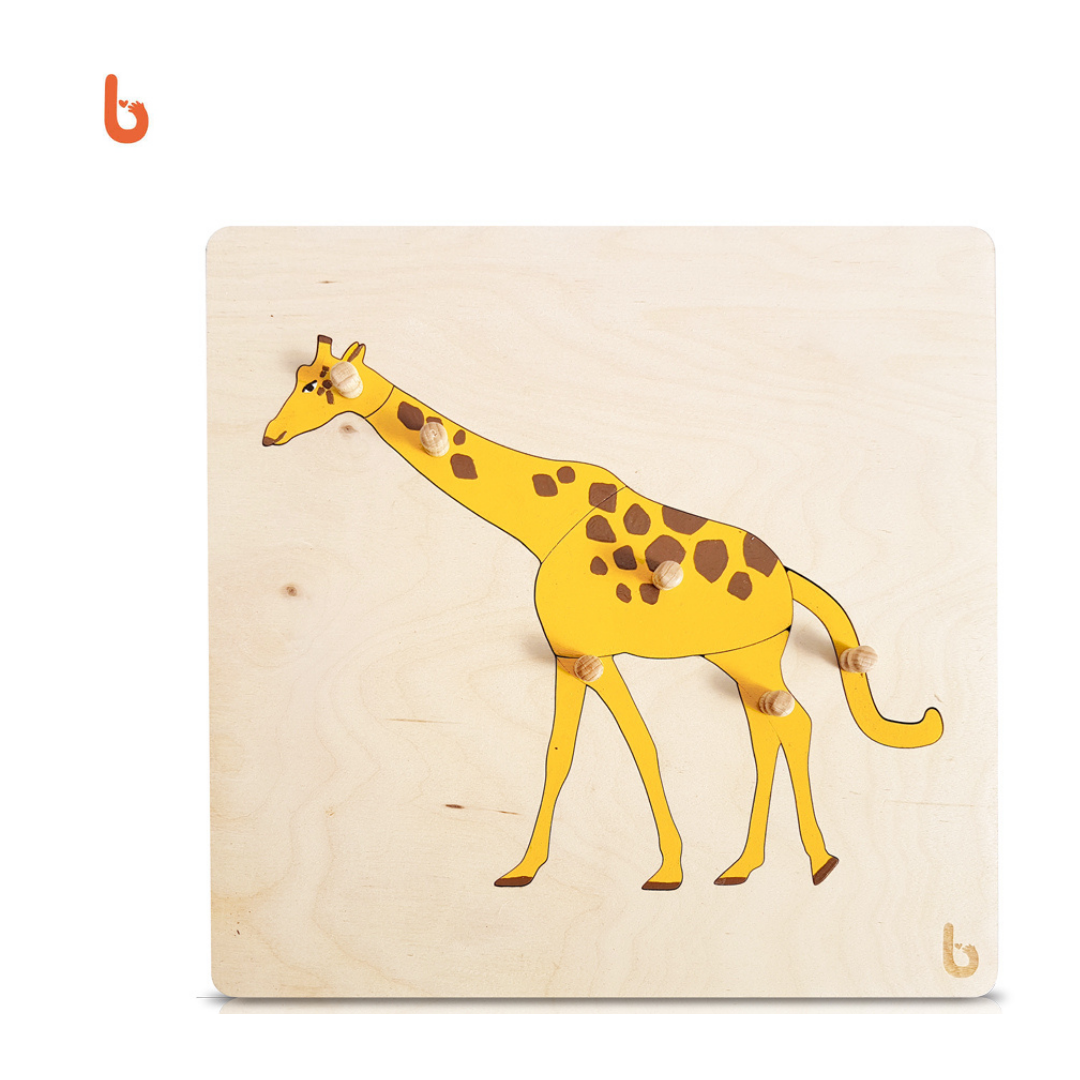 The jigsaw puzzle consists of a wooden frame with rounded corners and a giraffe silhouette carved into the centre, allowing the various joints to be placed inside. The joints are made of wood and hand-painted, and all have knobs that allow an easy grip to properly handle the parts and to facilitate fine motor skills in the hand. Manual activity favours sensory memory, allows for experiences that follow on from real activities or stimulate exploration of the environment. Interlocking allows the provision of scientific knowledge, in this case related to zoology. It supports the development of language and facilitates the recognition of all parts of the animal.