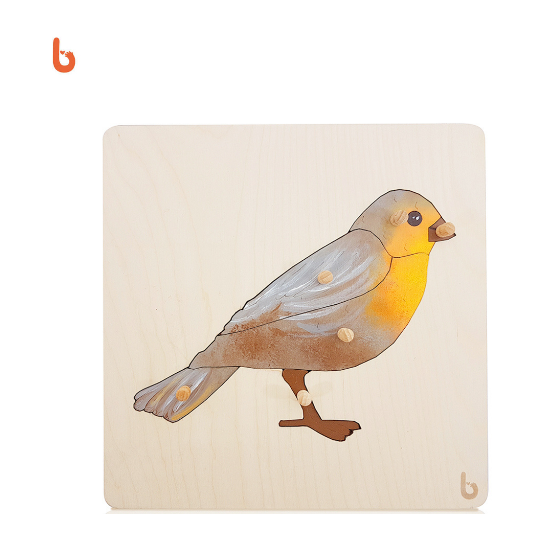 The puzzle is made up of a wooden frame with rounded corners and, in the centre, the shape of a robin, which allows the various joints to be placed inside. The joints are made of wood and hand-painted, and all have knobs that make it easy to grip the parts and to observe them properly, as well as to facilitate fine motor skills in the hand. Manual activity favours sensory memory, allows for experiences that follow on from real activities or stimulate exploration of the environment. Interlocking allows the provision of scientific knowledge, in this case related to zoology. It supports the development of language and facilitates the recognition of all parts of the animal.
