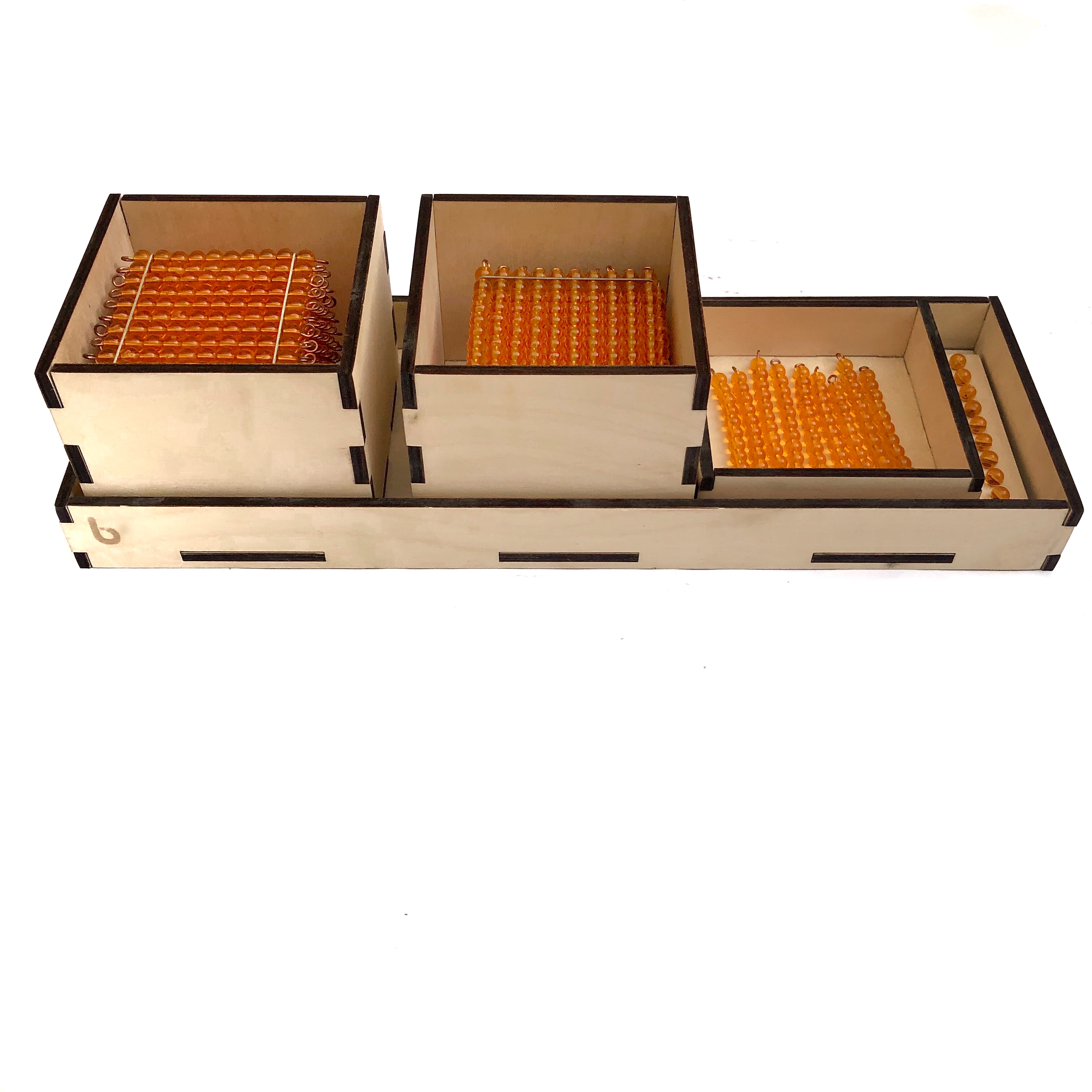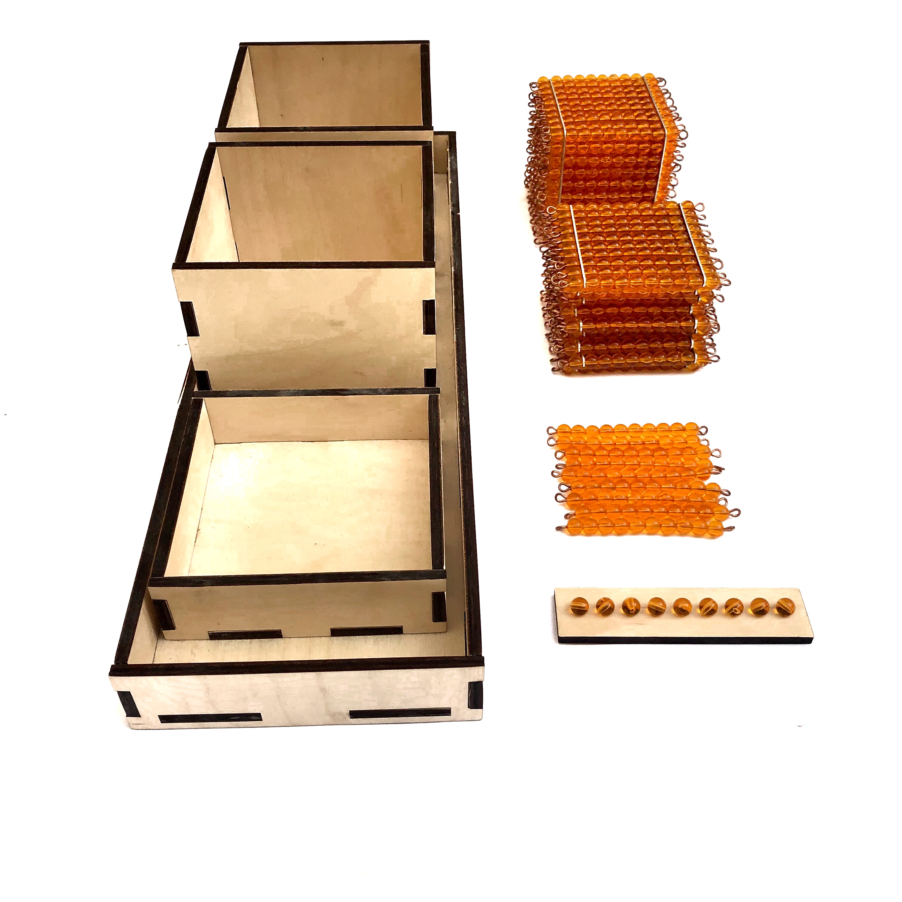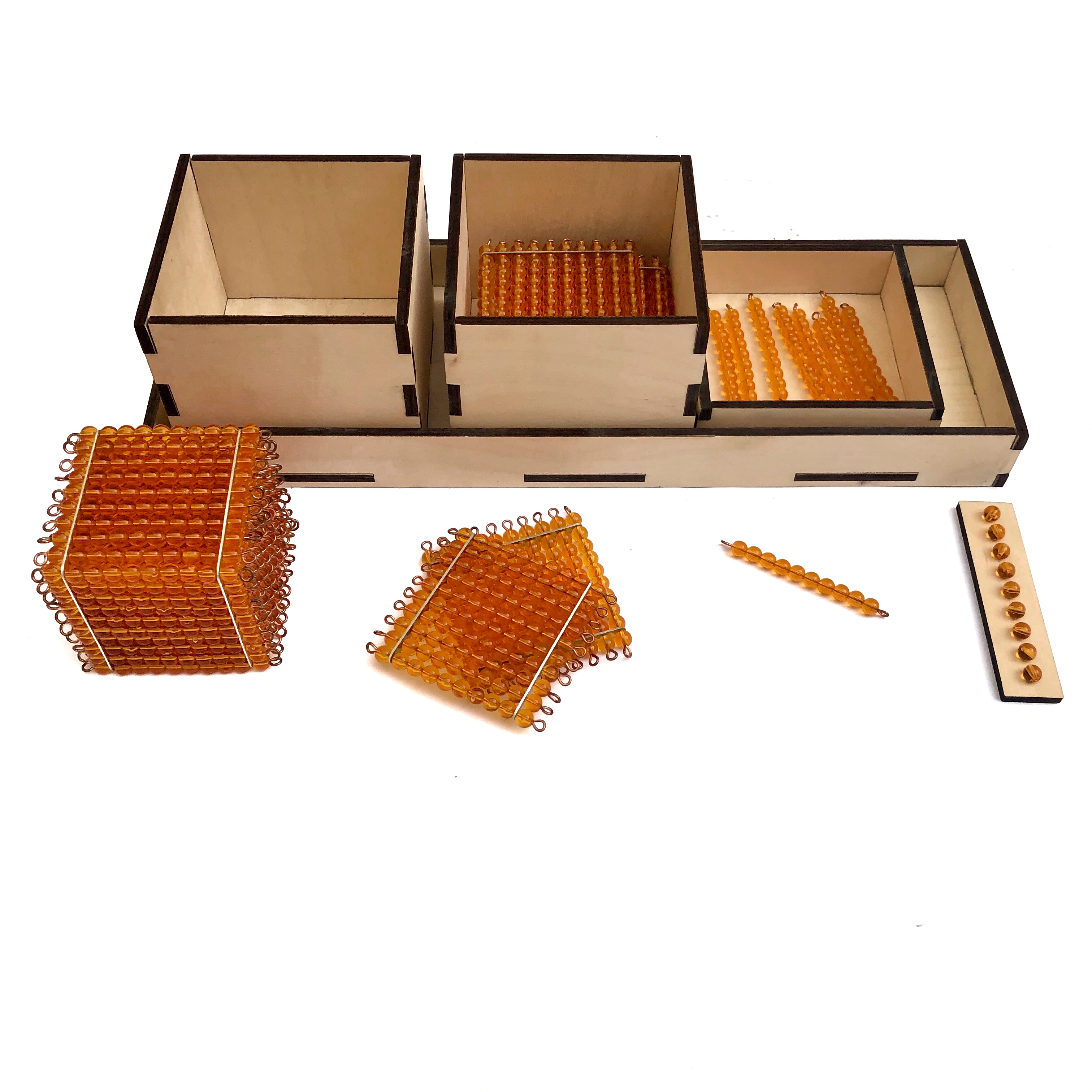 L'introduzione al sistema decimale è un materiale per lo sviluppo della mente matematica, e si offre come strumento facilitatore per la costruzione del sistema decimale; è composto da nove unità di perle oro, nove bastoncini da 10 perle oro, nove quadrati da 100 perle oro, un cubo da 1000 perle oro e un vassoio a 4 scomparti. Tutte le perle sono costruite in plastica, mentre il vassoio è in legno.