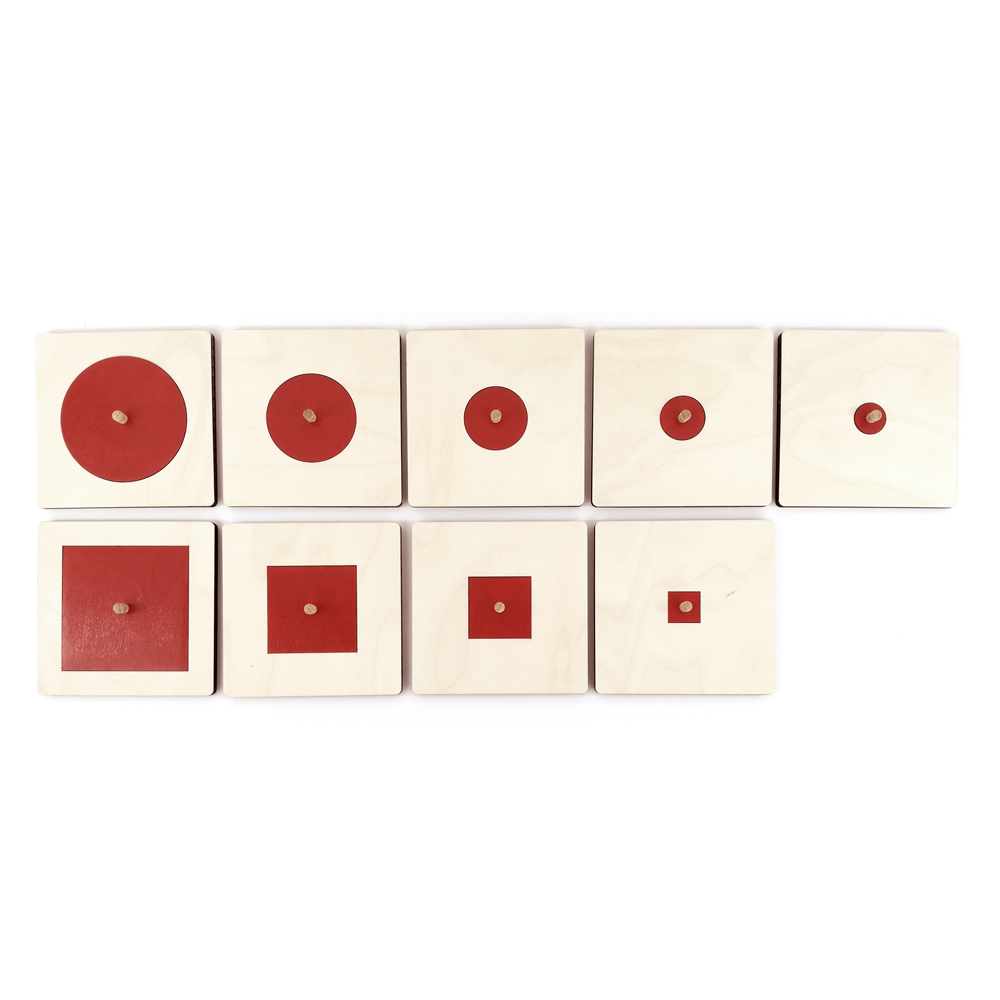 Figure inscritte e circoscritte è un gioco costruito interamente in legno betulla utile per lo studio della geometria. Il set è composto da nove cornici di base color legno, contenenti quattro quadrati di colore rosso, decrescenti in lunghezza e larghezza e cinque cerchi di colore rosso di diametro decrescente. Il gioco favorisce la scoperta delle figure inscritte e concentriche tramite concreta esperienza sensoriale, cerchi e quadrati sono dotati di pomelli per favorire una facile presa e manipolazione.