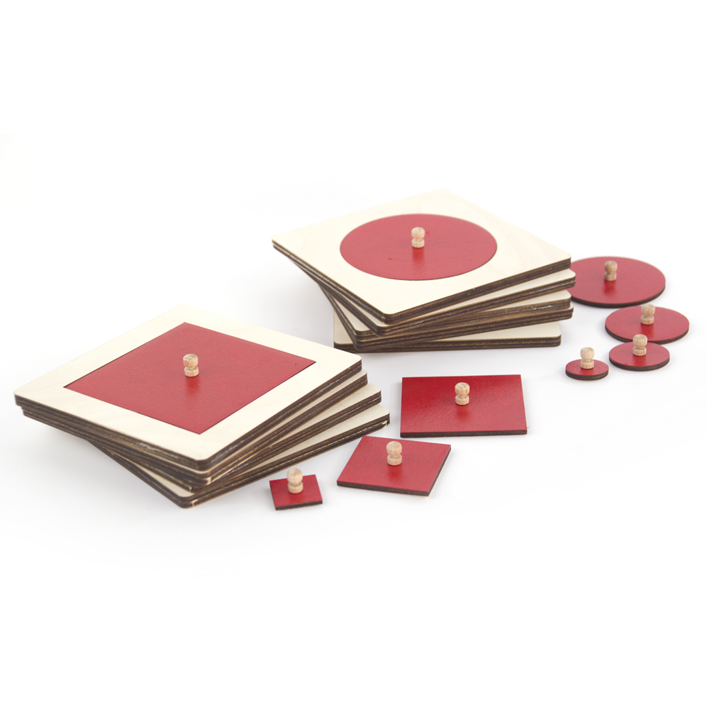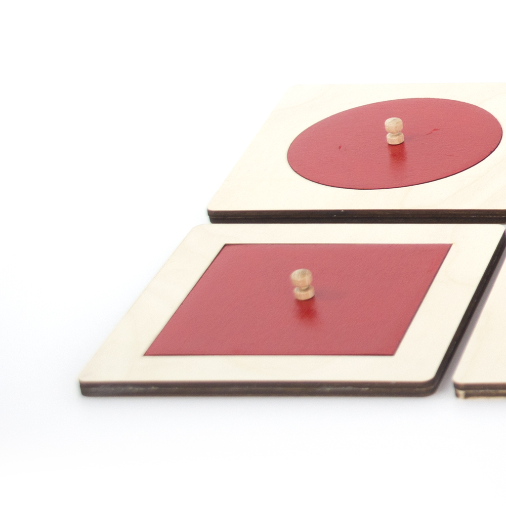 Materiale di geometria. Età: 5/6 anni. Figure inscritte e circoscritte è interamente in legno betulla, i pomelli sono in legno di faggio. Quadrati e cerchi sono dipinti a mano in rosso, con vernice ad acqua Luxens, certificate "Ecolabel".