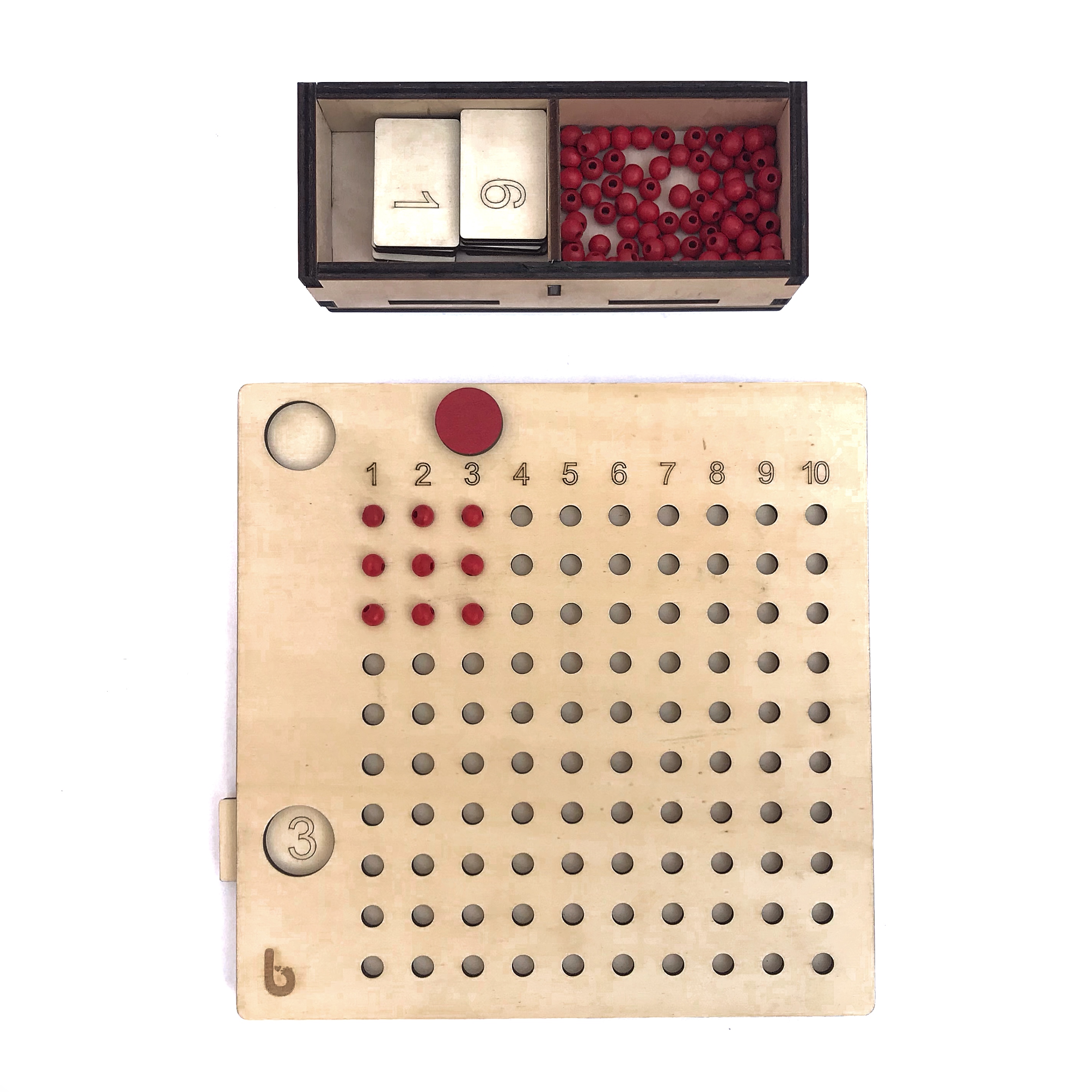 The multiplication table is an educational material for learning mathematics. It is recommended that the material be used from the age of 5. It is very useful for learning mathematics through play and for solving any difficulties in learning multiplication. The board, cards and beads are made of wood. The paints used are water-based, made by Luxen, with reduced environmental impact and Ecolabel certification.