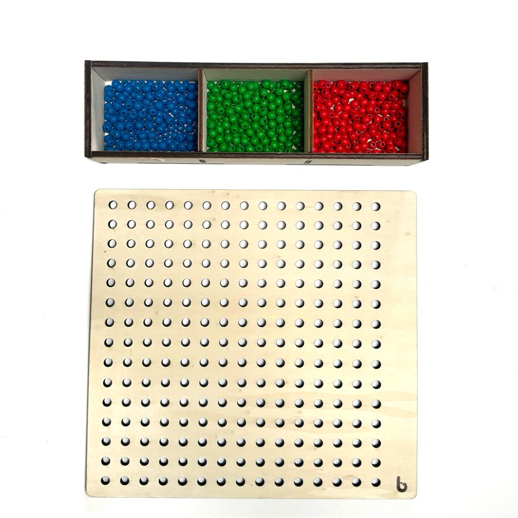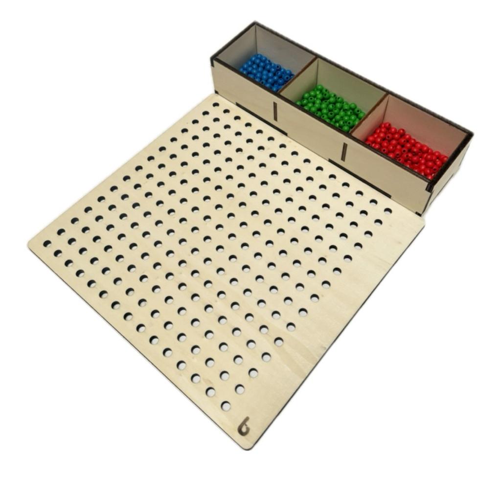 Dimensione tavola 28x28 cm spessore 0,6 cm; dimensione scatola: 29x11 cm altezza 6 cm spessore 0,6 cm. 150 perline rosse; 150 perline verdi; 150 perline blu.