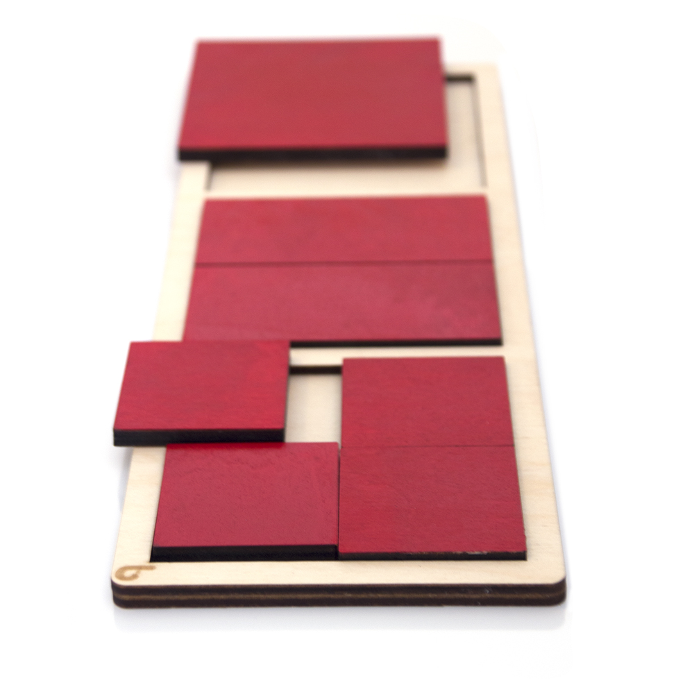 Materiale sensoriale 0-3: costituito da un insieme di oggetti "raggruppati secondo una determinata qualità fisica" - peso, temperatura, dimensione, forma, colore, suono, ecc. - il perfezionamento della percezione di ciascun senso favorisce l'esplorazione e la conoscenza. Il gioco può essere utilizzato a partire da 20 mesi a 3 anni. I quadrati sono dipinti a mano in rosso con vernici ad acqua Luxens a ridotto impatto ambientale, certificate "Ecolabel". La cornice base e le forme sono in legno betulla. Il puzzle dei quadrati e rettangoli può essere utilizzato in vari contesti ludici ed è anche utilissimo sussidio didattico.