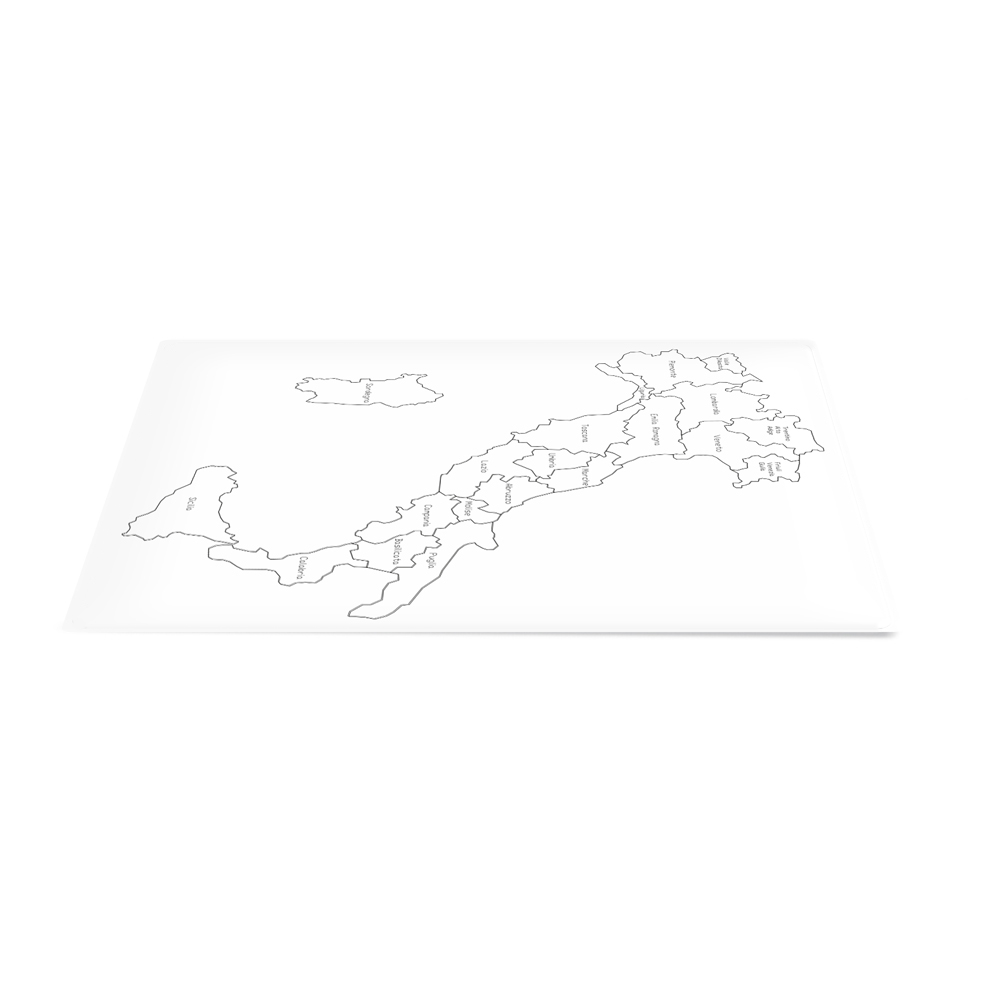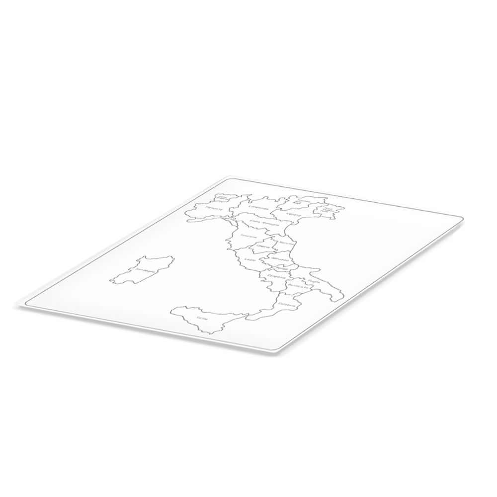 La cartina di controllo dell'Italia parlata-regioni è utile per rendere autonomo il gioco con l'incastro dell'Italia, la cartina, infatti, può essere posta sotto il puzzle per dare la possibilità di giocare autonomamente, correggere e verificare la posizione di tutte le regioni. La cartina è plastificata ed è definita "parlata" perchè indica il nome delle regioni. La cartina di controllo è utile per la scoperta e la conoscenza della geografia e per l'autoverifica. Il gioco-lavoro può essere implementato dall'utilizzo delle altre cartine che completano gradualmente l'approfondimento.