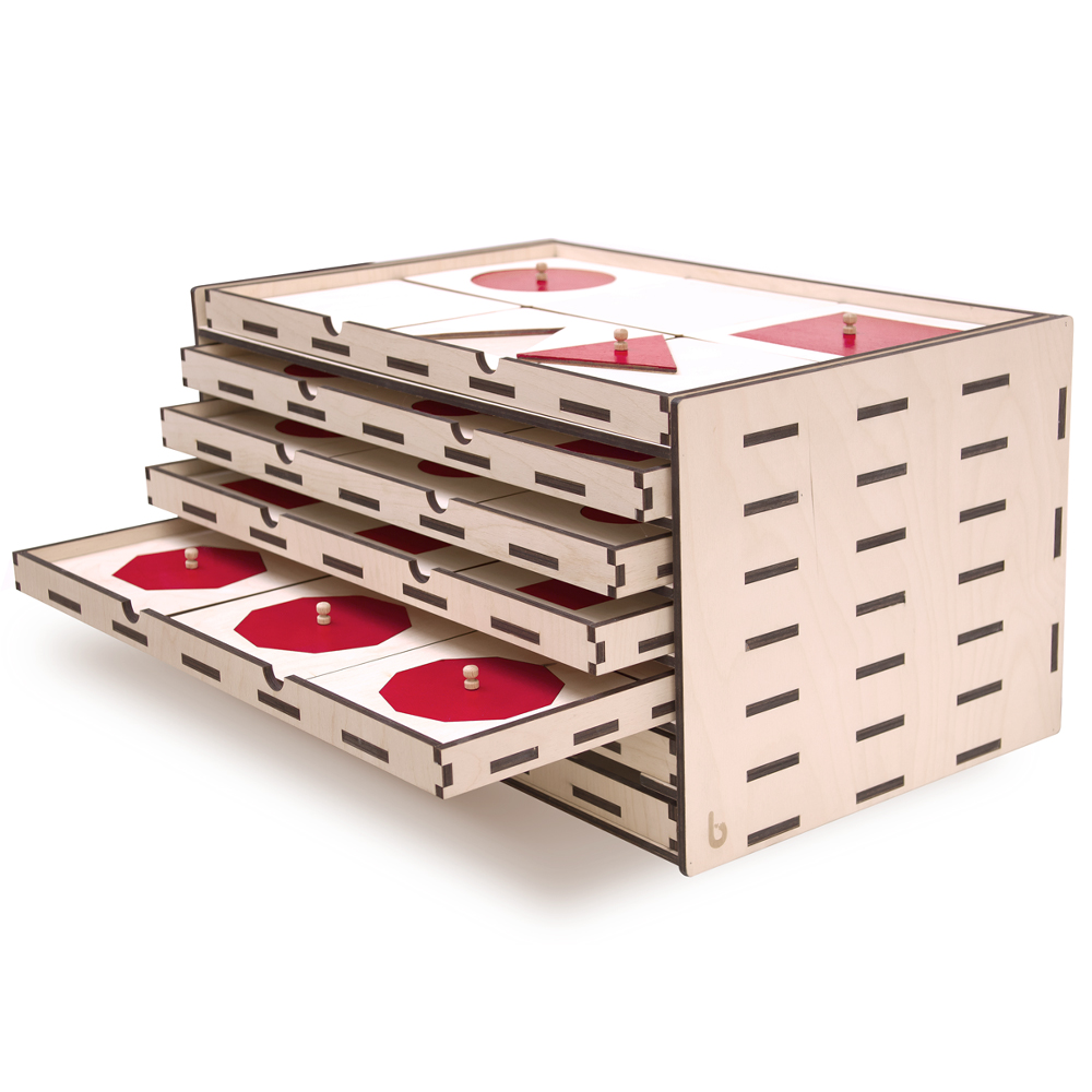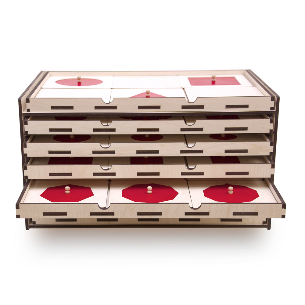 Materiale Sensoriale: costituito da un insieme di oggetti "raggruppati secondo una determinata qualità fisica" - peso, temperatura, dimensione, forma, colore, suono, ecc. - il perfezionamento della percezione di ciascun senso favorisce l'esplorazione e la conoscenza. Età: da circa tre anni. Il cofanetto è costruito interamente in legno betulla, le figure sono dipinte a mano, in rosso o in blu, con vernici ad acqua Luxens a ridotto impatto ambientale, certificate "Ecolabel". I pomelli sono in legno di faggio. Il gioco è utile per la conoscenza sensoriale, tramite vista e tatto, delle figure geometriche.