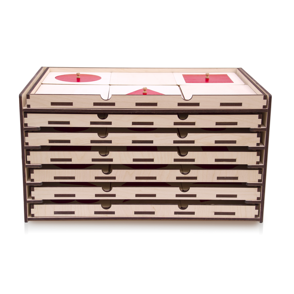 Il cofanetto delle figure geometriche piane è composto da sette cassetti, facilmente estraibili, che contengono ognuno sei piastrelle in cui sono intagliate categorie di figure geometriche piane, dotate di pomello per favorire la prensione e la manipolazione. La speciale presa del pomello favorisce il giusto movimento delle dita, utile per la prensione dello strumento di scrittura. Questo materiale permette di poter riconoscere e toccare diverse figure geometriche da estrarre e riposizionare nelle relative piastrelle che fungono da cornice di base. Il primo cassetto contiene un telaio di legno, le tre forme geometriche fondamentali che hanno in comune il lato del quadrato, il lato del triangolo equilatero e il diametro del cerchio e tre piastrelle color legno nelle quali si incastrano perfettamente le figure. Il secondo cassetto contiene un fiore, un trapezio, un ellisse, un ovale, un triangolo a lati curvi, un quadrilatero. Il terzo: un quadrato e cinque rettangoli di misura gradualmente decrescente; il quarto è composto da sei cerchi in gradazione; il quinto da sei triangoli, tre scaleni, tre isosceli; il sesto contiene sei poligoni: pentagono, esagono, ettagono, ottagono, ennagono, decagono. Il settimo cassetto contiene sei figure varie: fiore, trapezio scaleno, trapezio rettangolo, quadrilatero, triangolo ottusangolo scaleno, quadrifoglio. Poter osservare e toccare le forme stimola il senso tattile - muscolare per la conoscenza delle figure geometriche e aiuta nell'esercizio di prescrittura. Trovare la giusta posizione favorisce lo sviluppo di attenzione e concentrazione. Il materiale è realizzato completamente in legno betulla.