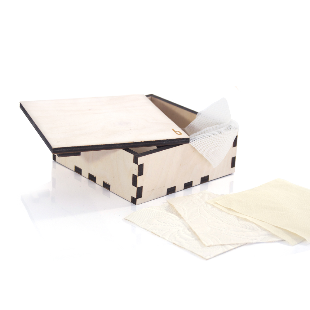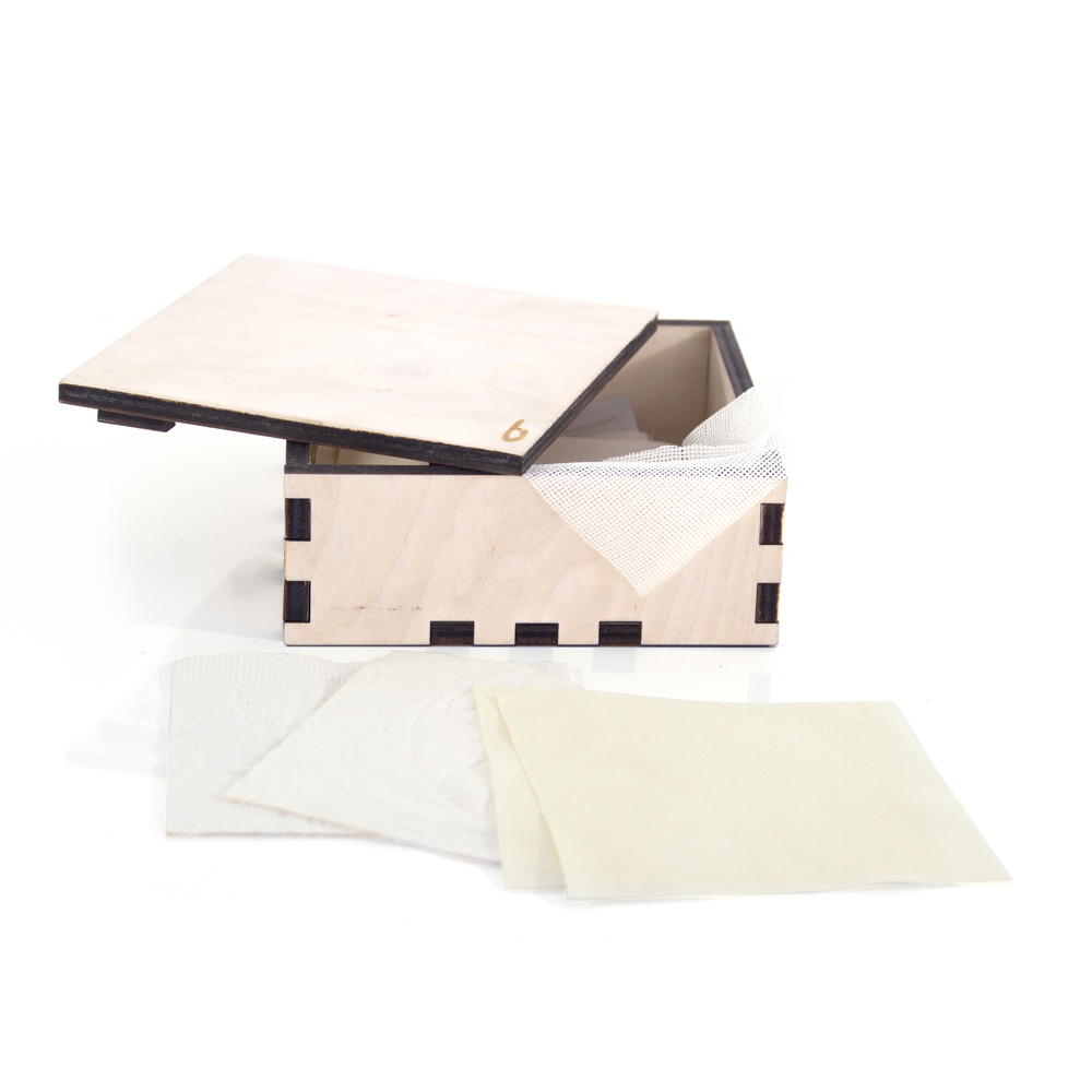 Materiale sensoriale: costituito da un insieme di oggetti "raggruppati secondo una determinata qualità fisica" - peso, temperatura, dimensione, forma, colore, suono, ecc. - il perfezionamento della percezione di ciascun senso favorisce l'esplorazione e la conoscenza. A partire da tre anni circa. La scatola è in legno betulla, contiene 6 coppie di tessuti di colore bianco di diverse tipologie. I sensi, "finestre sul mondo", accompagnano lo sviluppo. Il gioco delle stoffe, attraverso una manipolazione attiva, è utile per l'educazione al tatto.