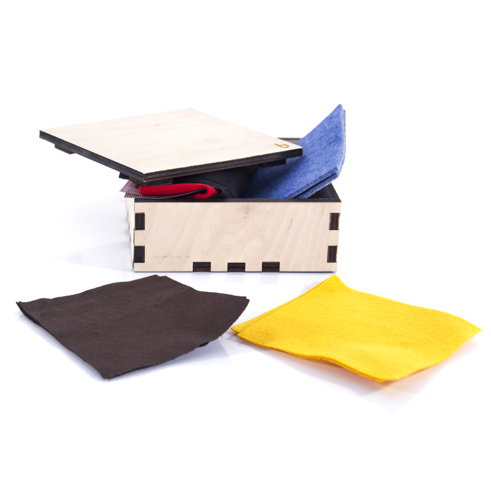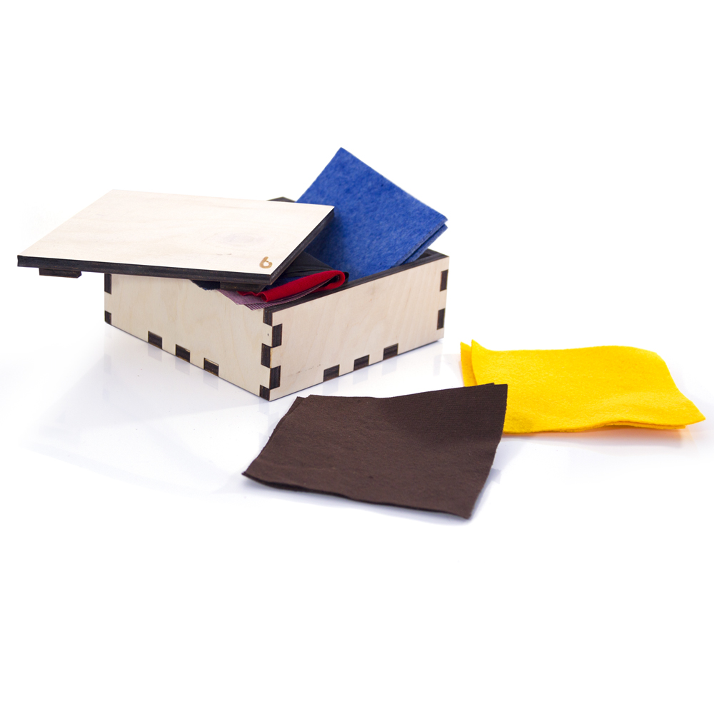 Materiale sensoriale: costituito da un insieme di oggetti "raggruppati secondo una determinata qualità fisica" - peso, temperatura, dimensione, forma, colore, suono, ecc. - il perfezionamento della percezione di ciascun senso favorisce l'esplorazione e la conoscenza. A partire da tre anni circa. La scatola è in legno betulla, contiene 6 coppie di tessuti differenti anche nel colore. I sensi, "finestre sul mondo", accompagnano lo sviluppo. Il gioco delle stoffe colorate, attraverso una manipolazione attiva, è utile per l'educazione al tatto e alla vista.
